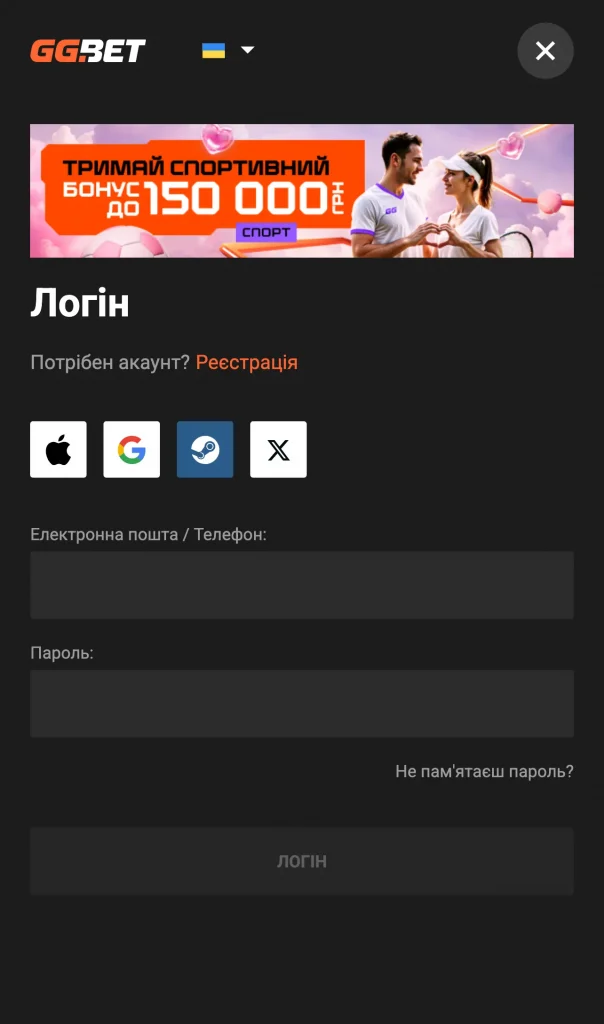 На головній сторінці розміщена кнопка «Вхід» — достатньо ввести email або номер телефону та пароль. Після цього користувач одразу потрапляє до особистого кабінету GGBet, де можна керувати балансом, робити ставки, запускати автомати та активувати бонуси.